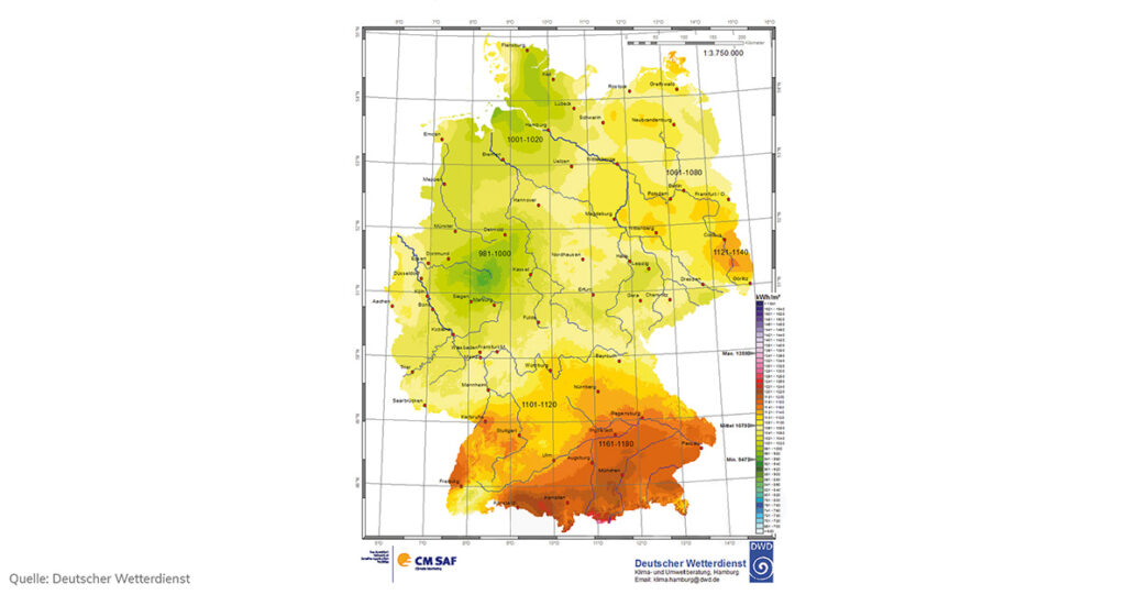 In Deutschland beträgt die jährliche Sonneneinstrahlung etwa 1.000 Kilowattstunden (kWh) pro Quadratmeter. Etwa ein Sechstel davon kann man durch Solarzellen in Strom umwandeln. Pro Kilowattpeak installierter PV-Leistung können in Baden-Württemberg jährlich bis zu 1.200 Kilowattstunden elektrischer Strom erzeugt werden.
