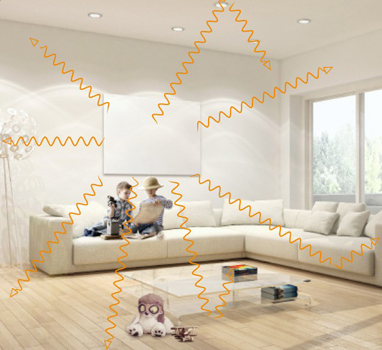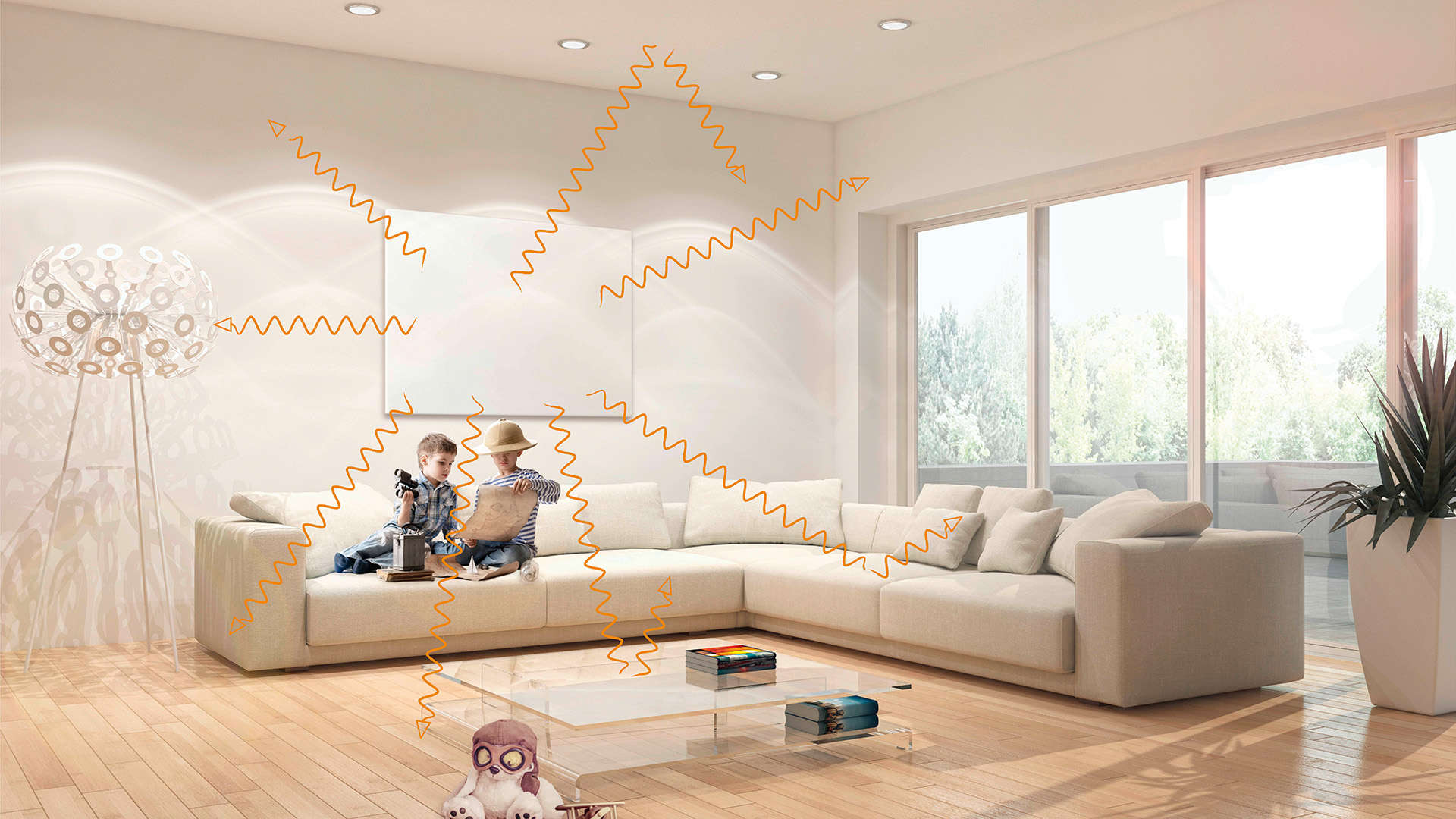 _Bei einer Infrarot-Heizung handelt es sich um eine Strahlungswärme, vergleichbar mit der Wirkung der Sonne. Hier werden Personen, Wände oder Einrichtungsgegenstände direkt erwärmt. Personen, die sich im Wirkungsbereich von rund 3 Metern zur Heizplatte befinden, spüren die Wärme unmittelbar. Es entsteht ein wohltuendes Gefühl, vergleichbar mit dem Sonnenlicht oder einem Kaminfeuer.